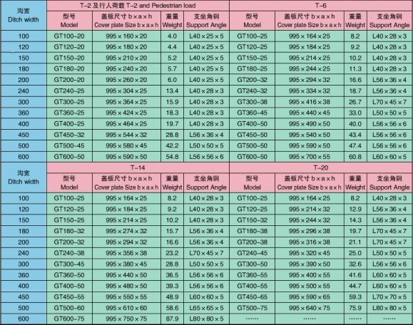 GT型溝蓋板適用于除公路外的道路場(chǎng)合,一般車流量不大。當(dāng)作為橫斷溝溝蓋使用時(shí),需考慮到蓋板跳起的危險(xiǎn),應(yīng)采用螺栓固定式溝蓋,GT型鋼格板溝蓋適用于帶支座沿口(T型溝)的溝上,沿口通常用角鋼砌護(hù)。